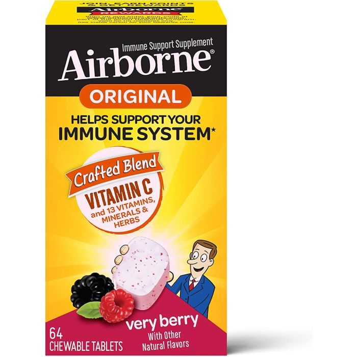 Strengthen immunity with Airborne Vitamin C 1000mg 64 Chewable Tablets. Delicious Very Berry flavor with antioxidants. Includes 13 vitamins, minerals, and herbs. Supports overall immune system health. Convenient chewable tablets, no water needed. Perfect for daily use at home or on the go.