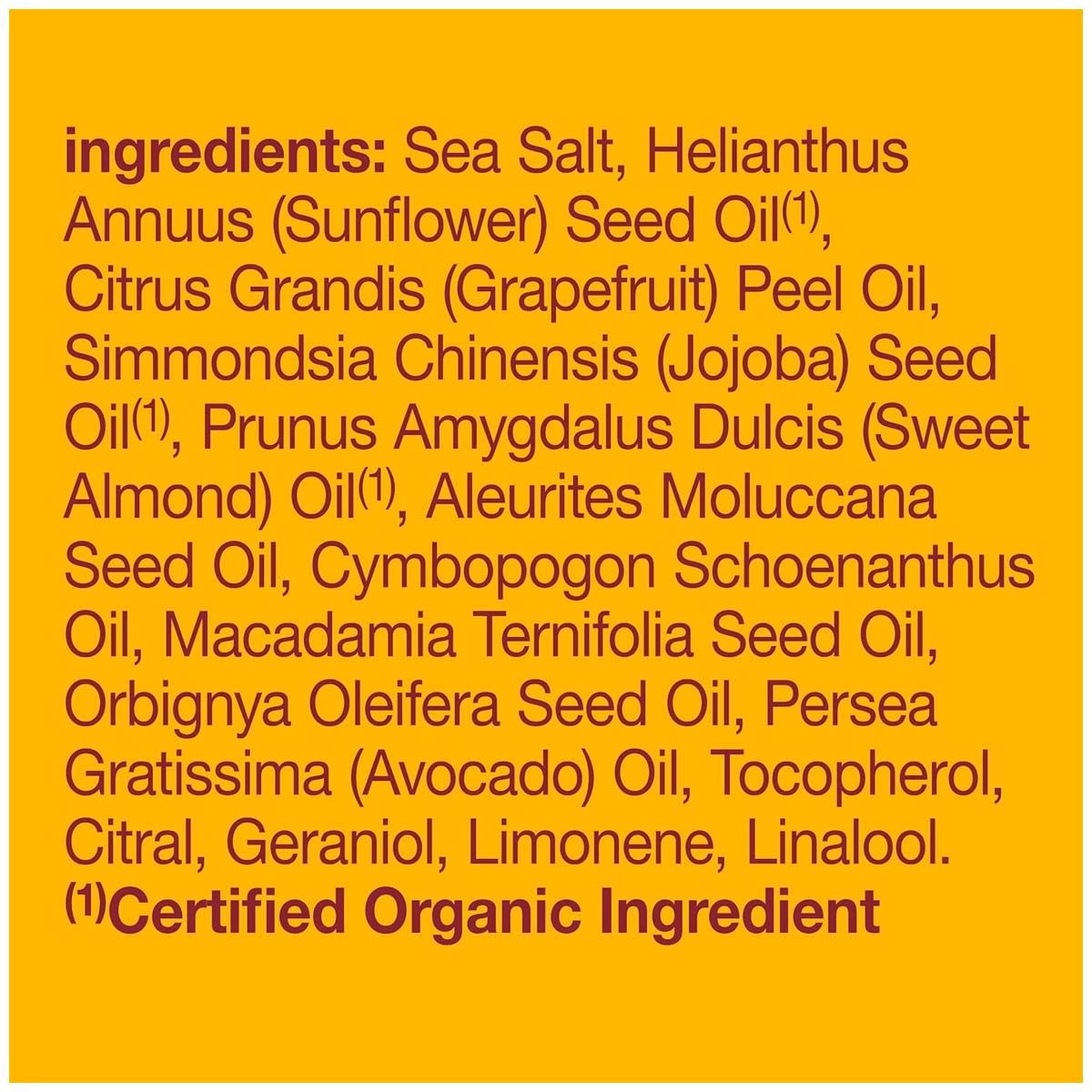 | Sea Salt, Helianthus Annuus (Sunflower) Seed Oil*, Citrus Grandis (Grapefruit) Peel Oil, Simmondsia Chinensis (Jojoba) Seed Oil*, Prunus Amygdalus Dulcis (Sweet Almond) Oil*, Aleurites Moluccana Seed Oil, Cymbopogon Schoenanthus Oil, Macadamia Ternifolia Seed Oil, Orbignya Oleifera Seed Oil, Persea Gratissima (Avocado) Oil, Tocopherol, Citral, Geraniol, Limonene, Linalool. *Certified Organic Ingredients |