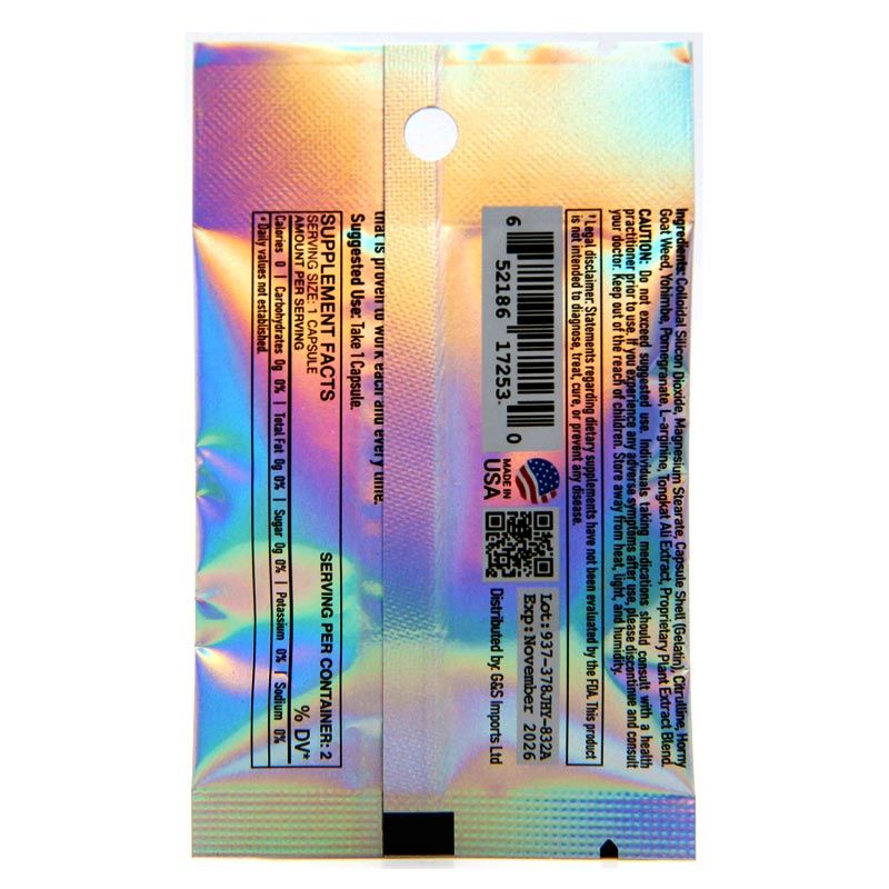 | Colloidal Silicon Dioxide, Magnesium Stearate, Capsule Shell (Gelatin), Citrulline, Horny Goat Weed, Yohimbe, Pomegranate, L-arginine, Tongkat Ali Extract. | |