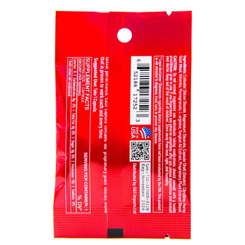 Colloidal Silicon Dioxide, Magnesium Stearate, Capsule Shell (Gelatin), Citrulline, Horny Goat Weed, Yohimbe, Pomegranate, L-arginine, Tongkat Ali Extract, Proprietary Plant Extract Blend.