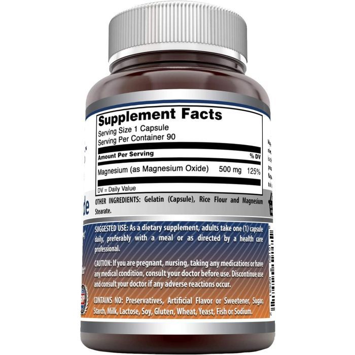 This product is free from preservatives, artificial flavors, sweeteners, sugar, starch, milk, lactose, soy, gluten, wheat, yeast, fish, and sodium, making it suitable for a wide range of dietary needs. Amazing Formulas Magnesium Oxide 500 mg Capsules are ideal for adults seeking to improve their magnesium intake effectively.