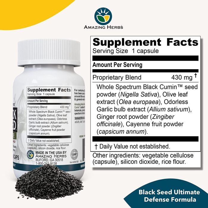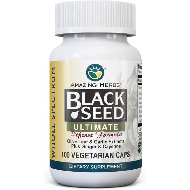 Amazing Herbs Whole Spectrum Black Seed Ultimate combines Black Cumin Seed with Olive Leaf, Garlic, Ginger, and Cayenne to support immune, cardiovascular, and digestive health.