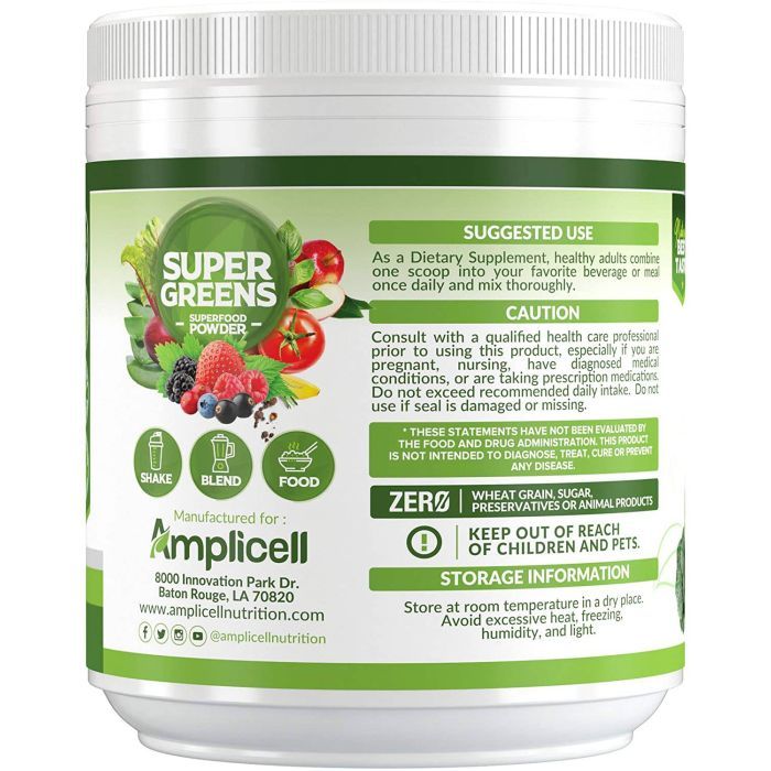 Mix 1 scoop (9g) of Amplicell Super Greens Extract Formula with 8–12 oz of water, juice, or a smoothie. Best consumed in the morning or midday for sustained energy and detox support. Can be taken with or without meals.