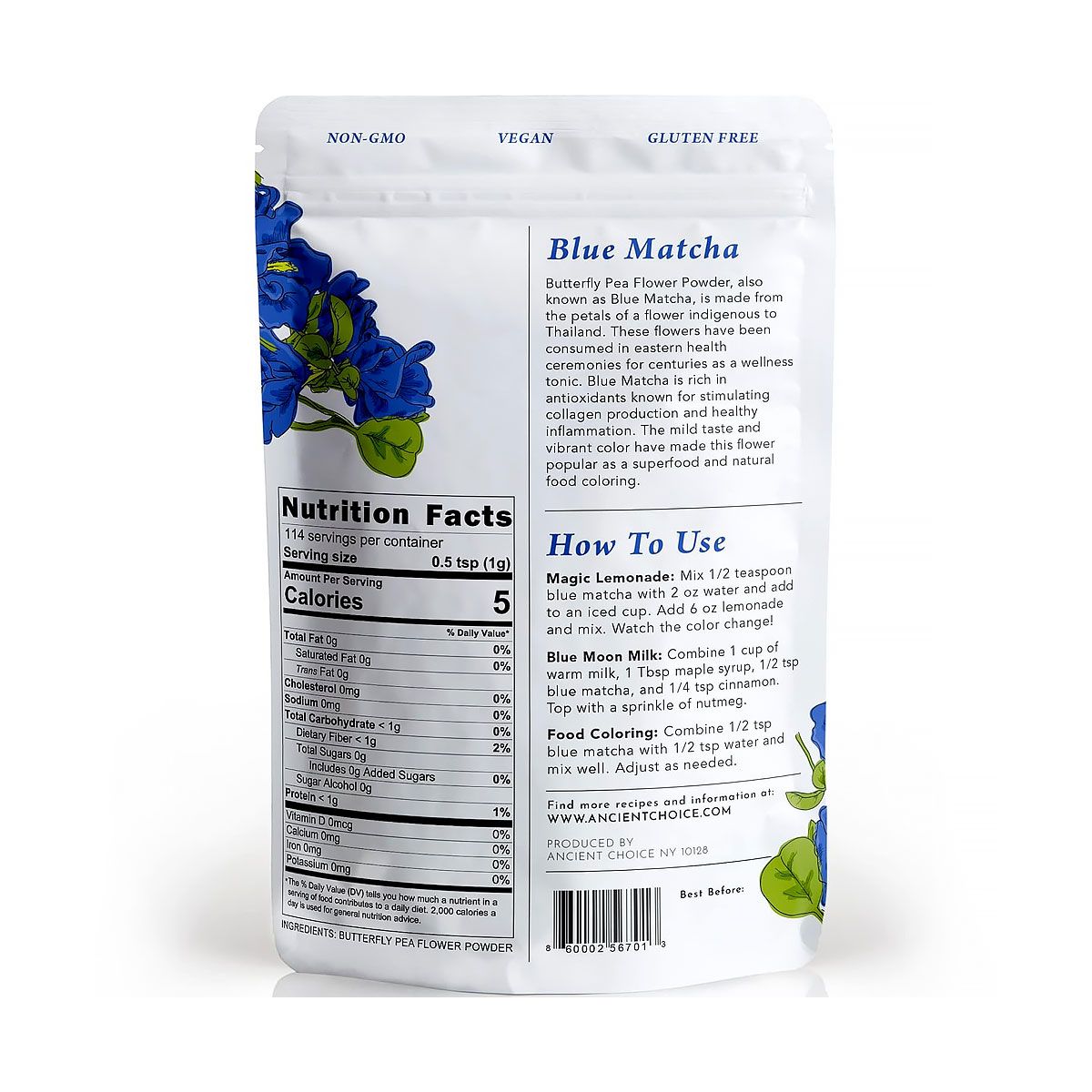 | Ancient Choice | Butterfly Pea Flower Powder | 0.5 tsp (1g) | Powder | 4 oz (114g) |
