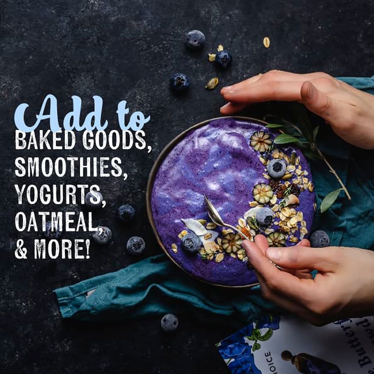 Take 0.5–1 teaspoon of Butterfly Pea Flower Powder daily. Mix into teas, lattes, smoothies, or desserts.