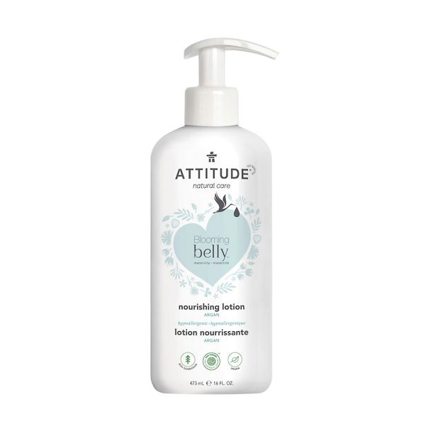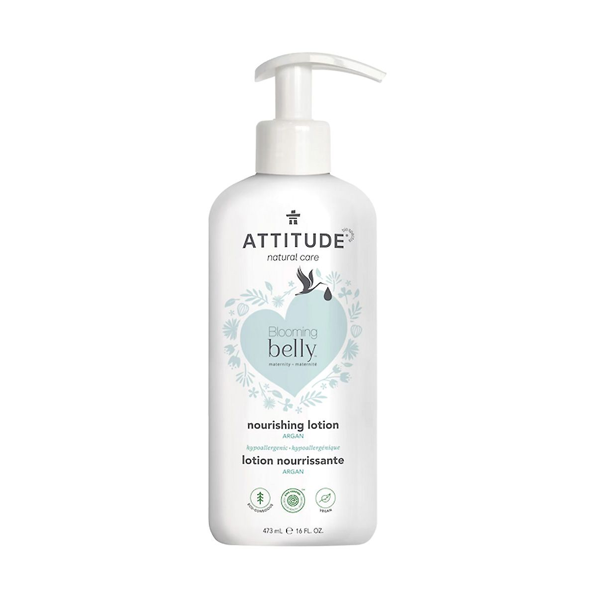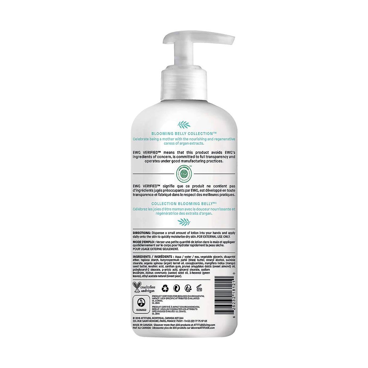 ATTITUDE Blooming Belly Nourishing Lotion with Argan Oil hydrates and softens skin. Perfect for maternity care. EWG Verifiedâ„¢, hypoallergenic, vegan, cruelty-free, and safe for sensitive skin. Gentle daily moisturizer with natural fragrance. Eco-friendly and dermatologically tested. 473ml bottle.