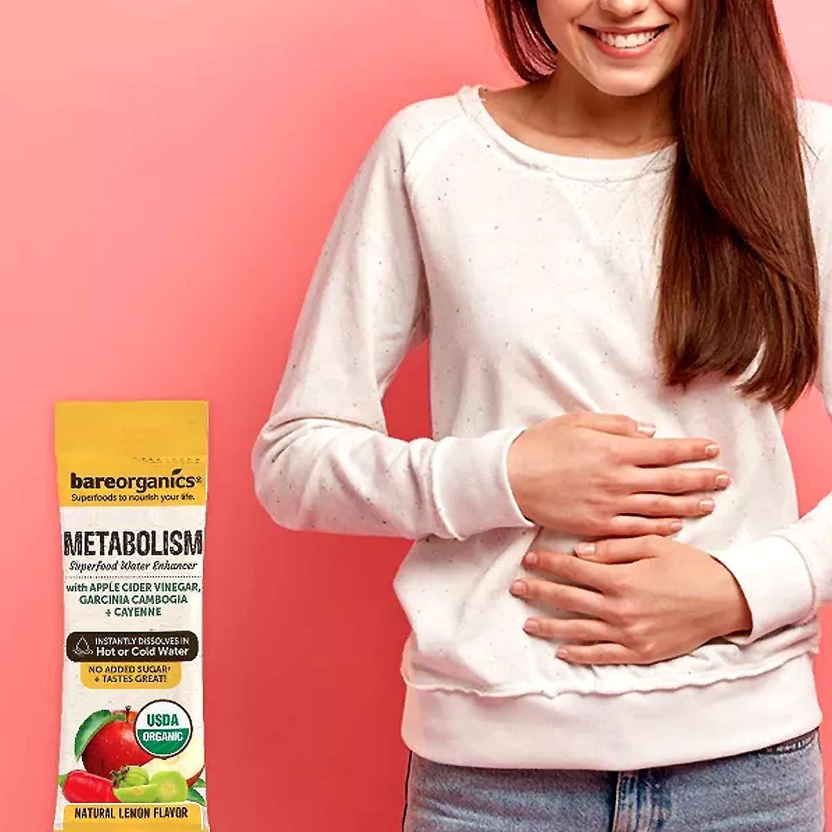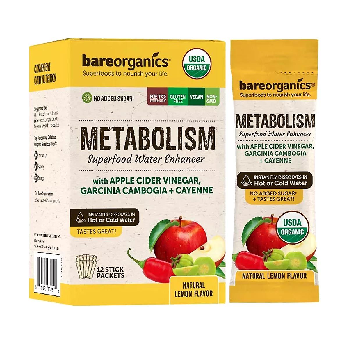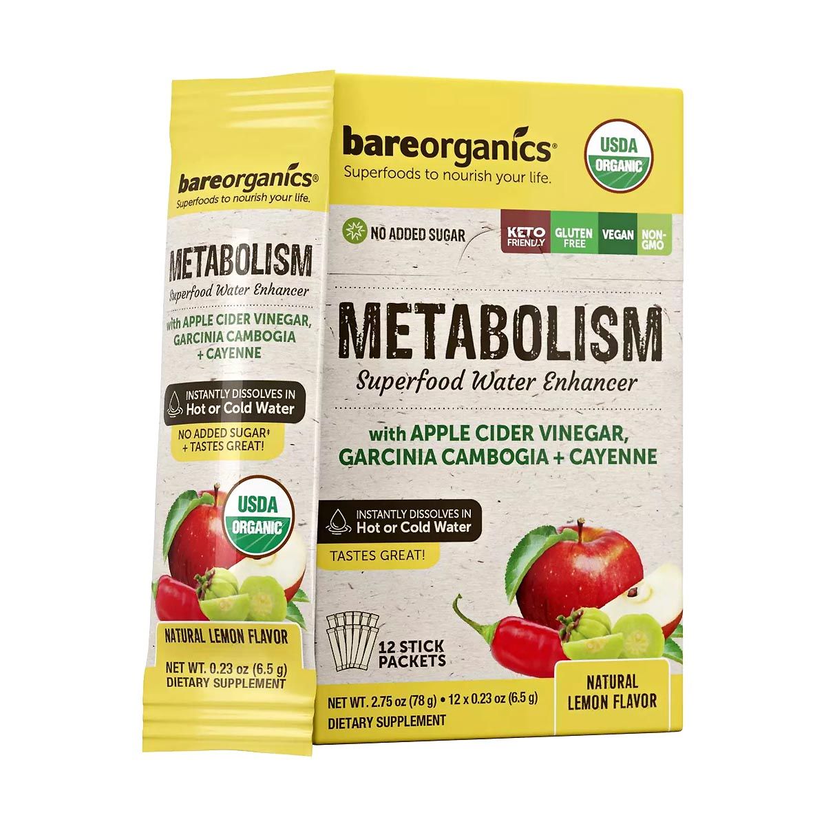 - Bareorganics Metabolism Superfood Water Enhancer combines key natural ingredients like apple cider vinegar, garcinia cambogia, and cayenne pepper in a convenient, delicious lemon-flavored stick packet. This USDA organic enhancer supports weight management and metabolism without added sugars.