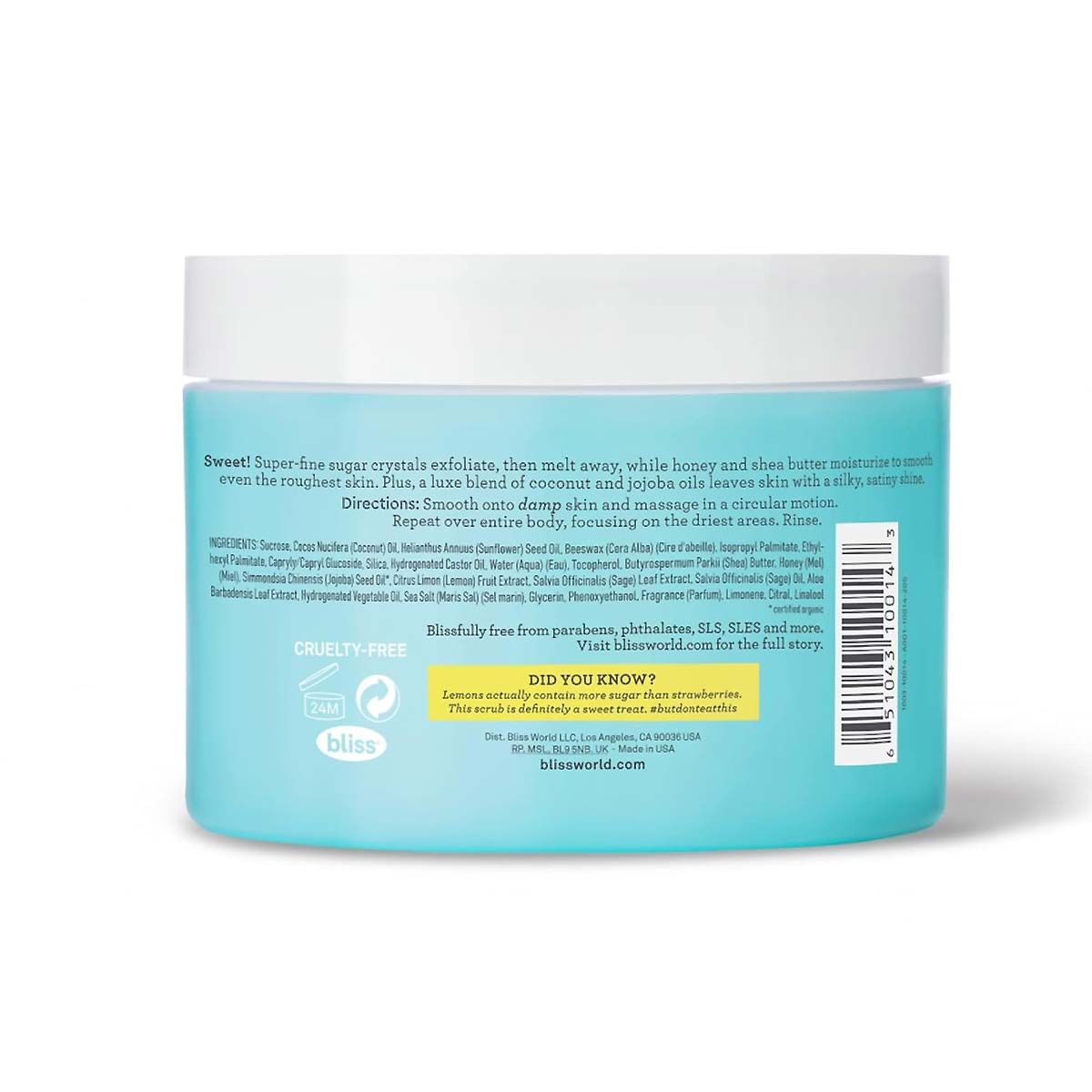 Bliss Lemon & Sage Satin-Skin Body Polish combines exfoliating sugar crystals with moisturizing shea butter and coconut oil for smooth, hydrated skin. This vegan and cruelty-free body polish also includes sunflower seed oil, honey, and jojoba oil to nourish and soften skin. Ingredients: sucrose, cocos nucifera (coconut) oil, helianthus annuus (sunflower) seed oil, beeswax, Ethylhexyl palmitate, caprylyl glycol, tocopherol, honey, simmondsia chinensis (jojoba) seed oil, citrus limon (lemon) peel oil, salvia officinalis (sage) leaf extract, aloe barbadensis leaf extract, sodium chloride, glycerin, phenoxyethanol, fragrance.