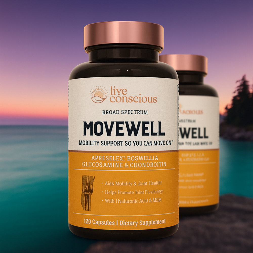 Live Conscious MoveWell Mobility Support is a broad-spectrum joint health supplement formulated with glucosamine, chondroitin, MSM, boswellia, and hyaluronic acid to support comfort, flexibility, and an active daily wellness routine.