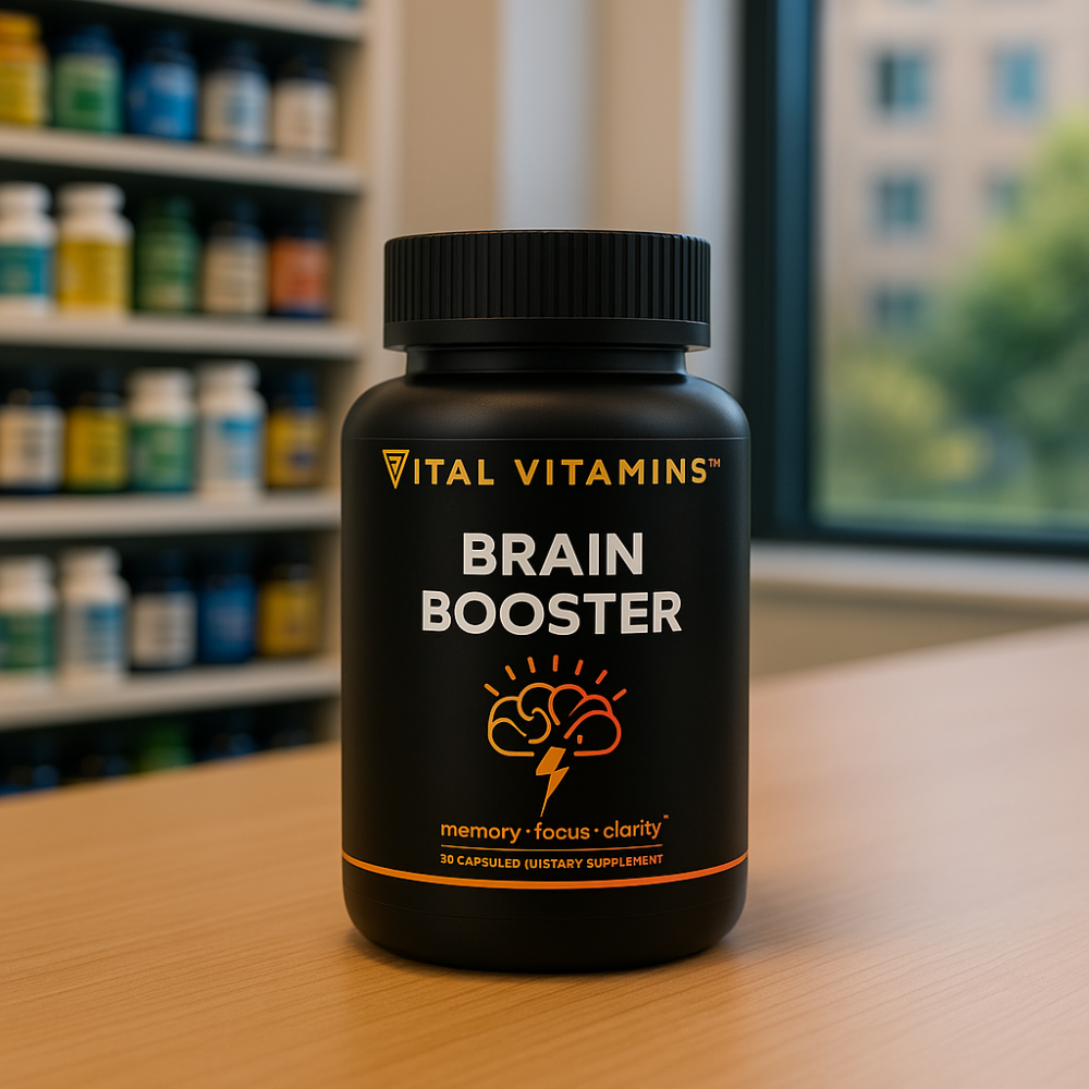 Vital Vitamins Brain Booster Nootropic Capsules provide a balanced blend of natural ingredients designed to support memory, focus, and mental clarity. This brain supplement includes ingredients such as vitamin B12, Bacopa, Ginkgo Biloba, Phosphatidylserine, and Rhodiola Rosea—commonly used for cognitive wellness and energy support. Ideal for professionals, students, and anyone wanting to enhance daily cognitive performance.