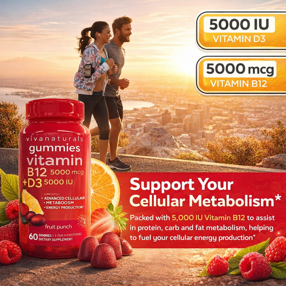 Viva Naturals Vitamin D3 + B12 Gummies are formulated for adults looking to support immune support and energy support as part of a simple daily wellness routine. This vitamin supplement combines two widely used nutrients in an easy-to-take gummy format, making daily consistency easier for busy lifestyles.