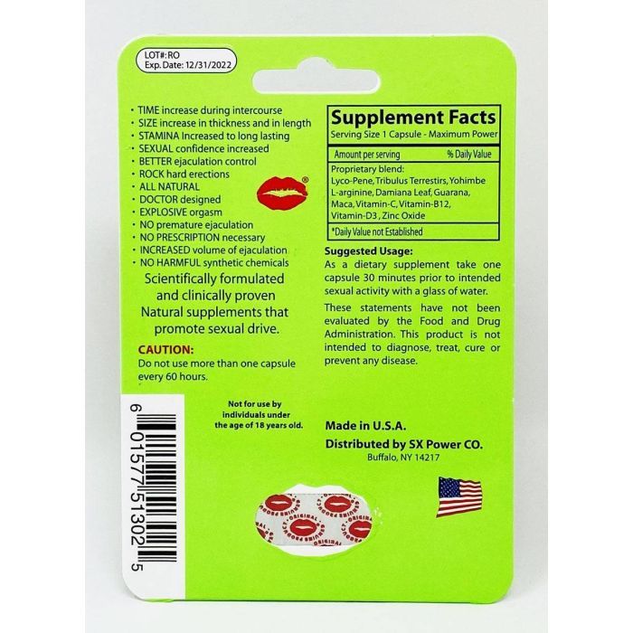 | L-Arginine, Tribulus Terrestris, Yohimbe, Damiana Leaf, Guarana, Maca, Vitamin-C, Vitamin-B12, Vitamin-D3, Zinc Oxide | Not Specified | Not Established |