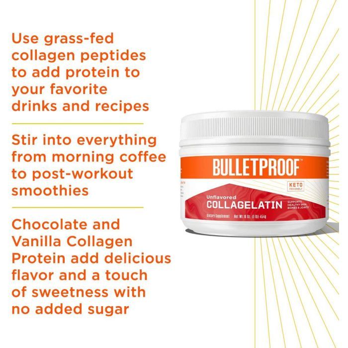 Bulletproof Unflavored Collagelatin is a keto-friendly collagen supplement. It supports healthy joints, bones, and glowing skin. Contains 11g protein per serving. Easily mixes in hot liquids. Made with grass-fed hydrolyzed collagen.