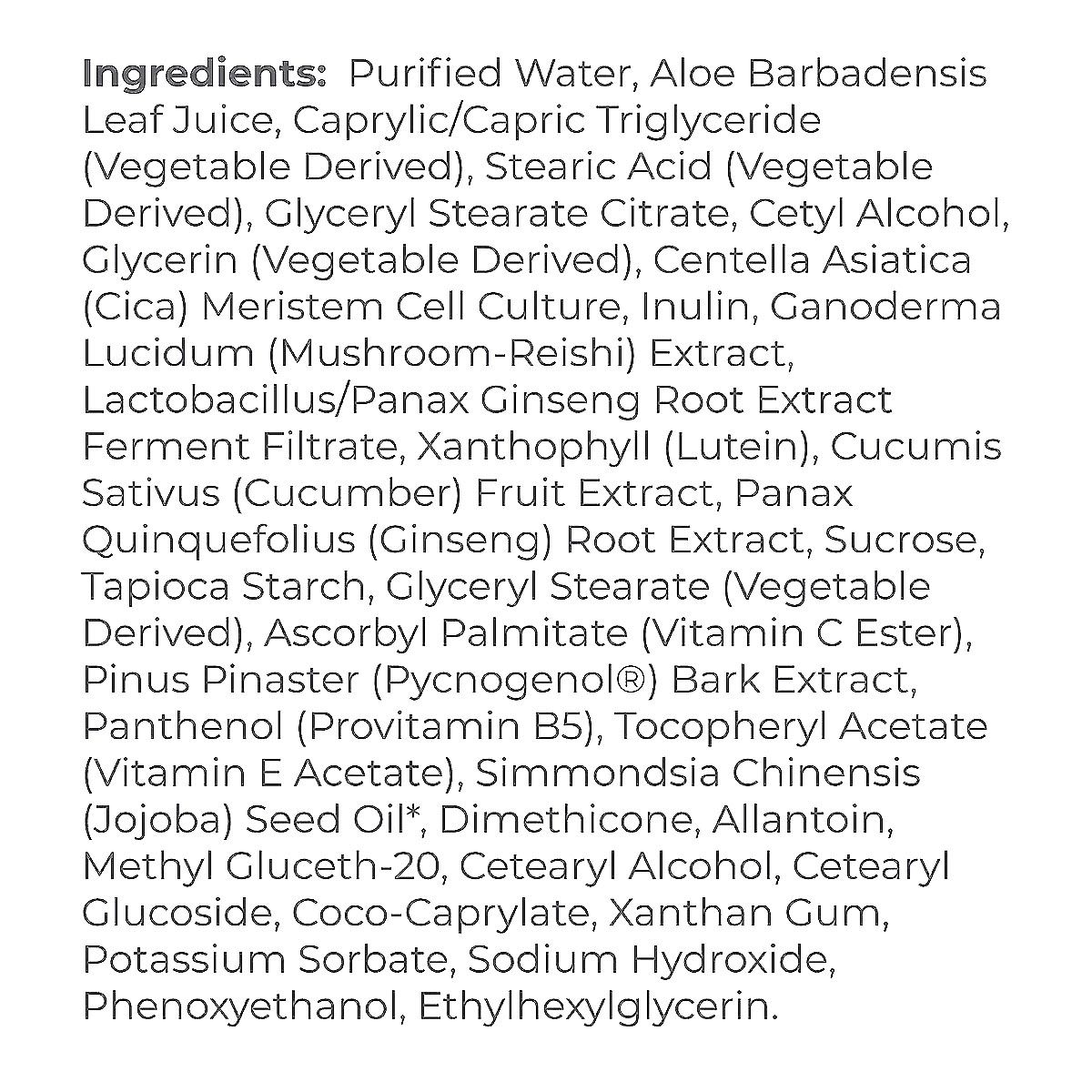 - Purified Water, Aloe Barbadensis Leaf Juice, Caprylic/Capric Triglyceride, Stearic Acid (Vegetable Derived), Glycerin (Vegetable Derived), Cetyl Alcohol, Glyceryl Stearate Citrate, Centella Asiatica (Cica) Meristem Cell Culture, Inulin, Ganoderma Lucidum (Mushroom-Reishi) Extract, Lactobacillus/Panax Ginseng Root Extract Ferment Filtrate, and more.