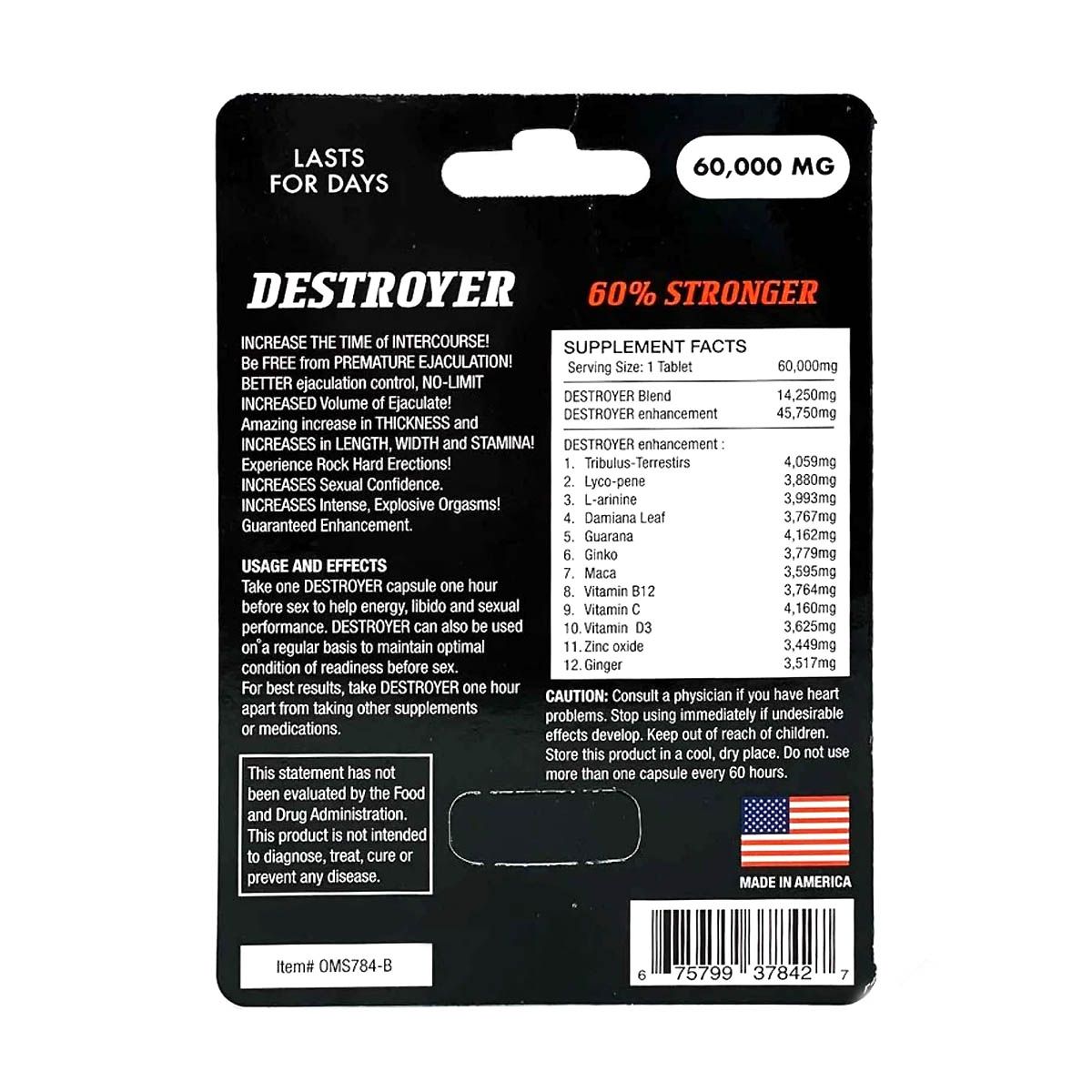 Destroyer 60K is a male enhancement supplement featuring a blend of Tribulus Terrestris, Lycopene, L-arginine, Damiana, and vitamins to support sexual stamina, erection quality, and overall sexual satisfaction for a confident and fulfilling experience.