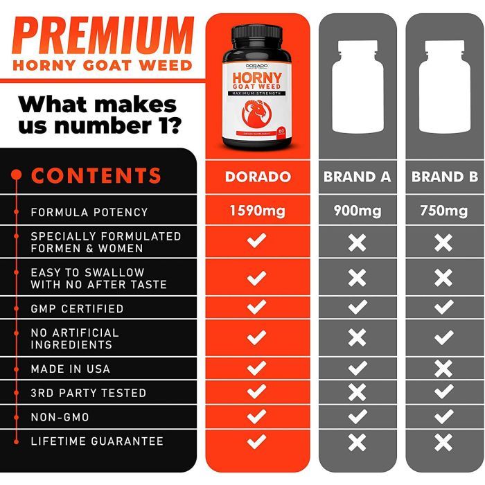 Dorado Nutrition Horny Goat Weed is a powerful 1590 mg herbal blend. Supports stamina, circulation, energy, and joint/back comfort. Formulated for men & women. GMP certified and third‑party tested. 60 capsules per bottle. Manufactured in the USA from premium ingredients.
