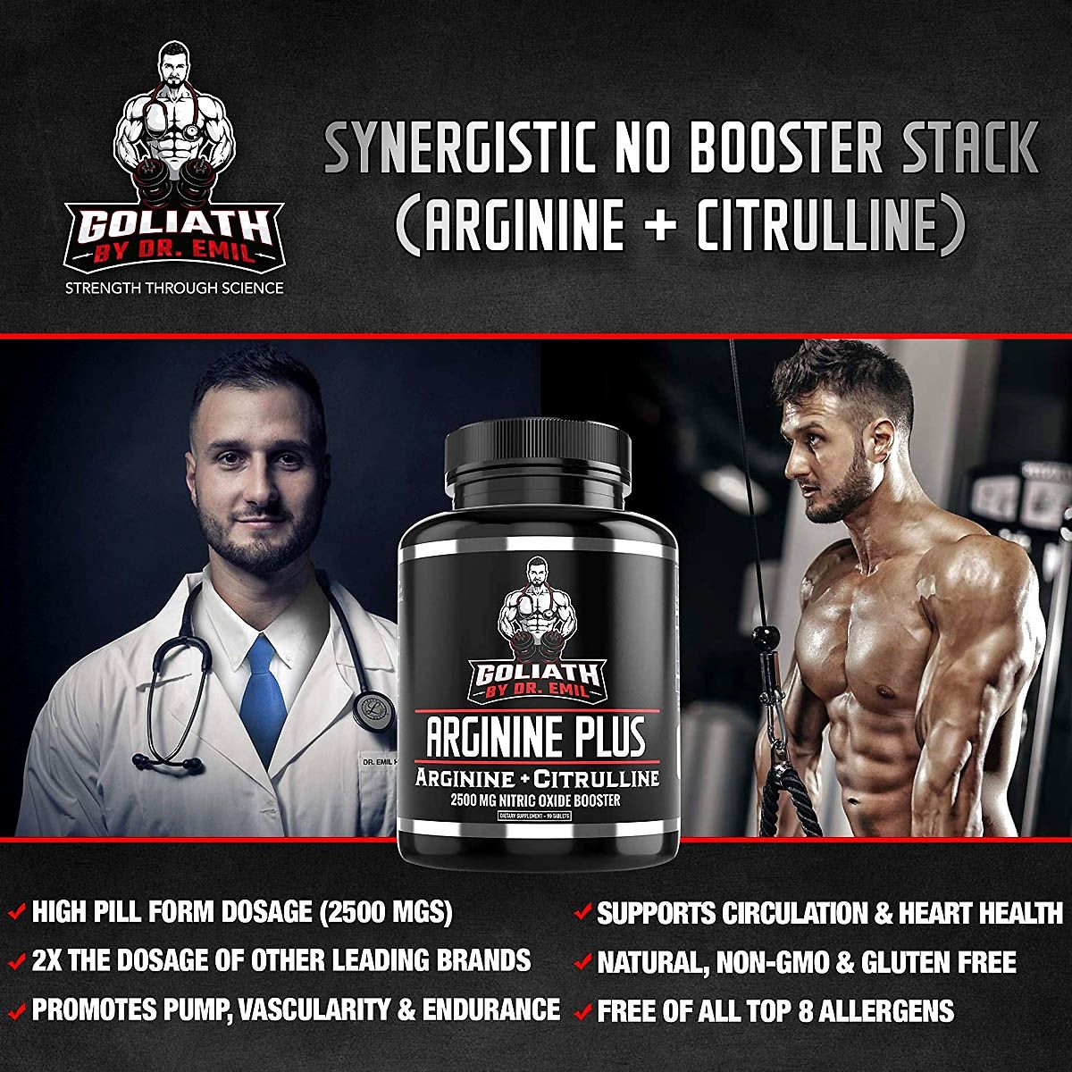 Featuring a powerful 2500 mg nitric oxide booster per serving, Dr. Emil Goliath Arginine Plus supports pump, vascularity, and endurance. The formula is natural, non-GMO, gluten-free, and free from the top 8 allergens, making it a safe choice for most users.