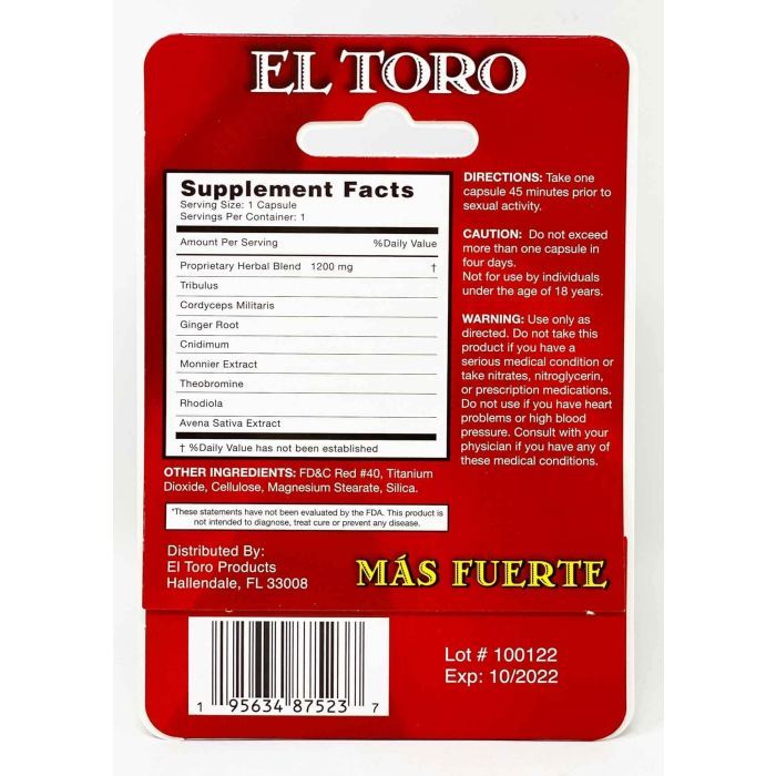 With a single dose capsule taken 45 minutes before sexual activity, El Toro Male Sexual Enhancement Red Pill offers convenience and powerful effects backed by trusted ingredients.