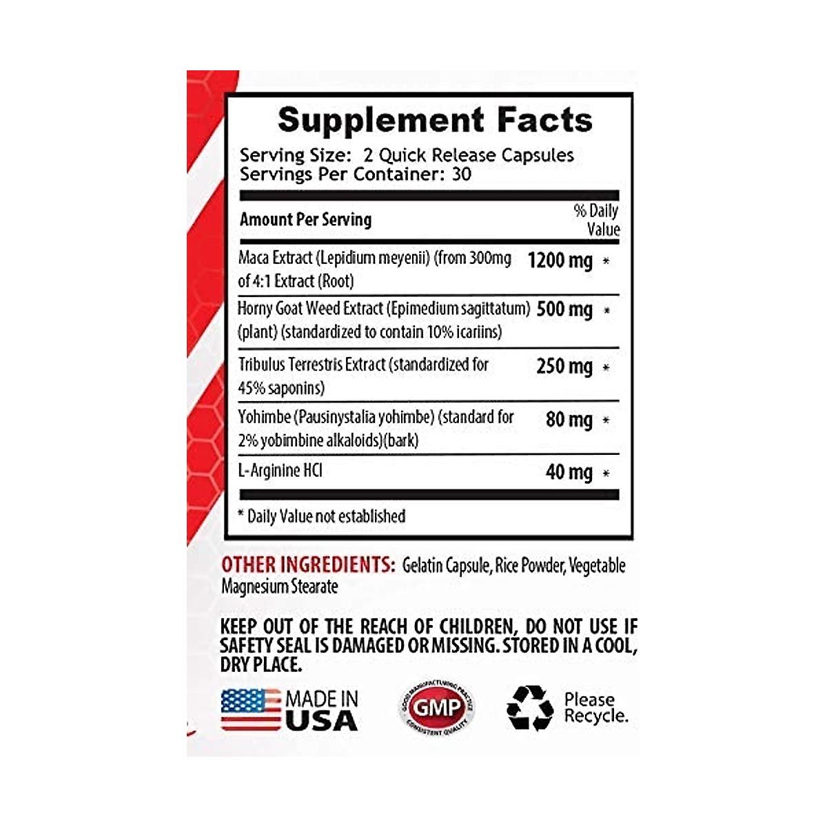 - Combines Maca, Horny Goat Weed, Tribulus, Yohimbe & L-Arginine