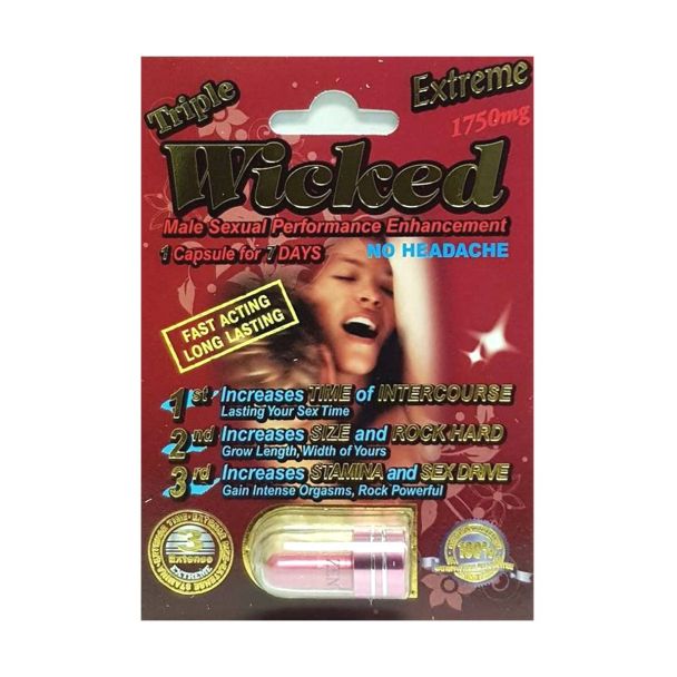 Triple Wicked Extreme is a potent male sexual performance enhancement pill designed to increase the duration, size, and stamina of your sexual encounters. With a powerful 1750mg formula, this fast-acting, long-lasting supplement requires only one capsule for 7 days to help you enjoy rock-hard erections and intense orgasms without headaches.