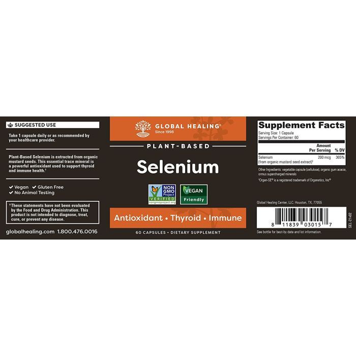 Global Healing Vegan Selenium 60 Capsules deliver 200 mcg of bioavailable selenium in vegan capsules to support immune and thyroid health.