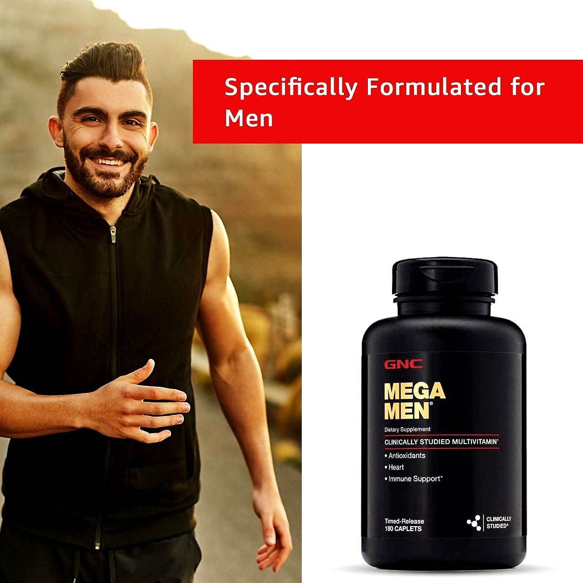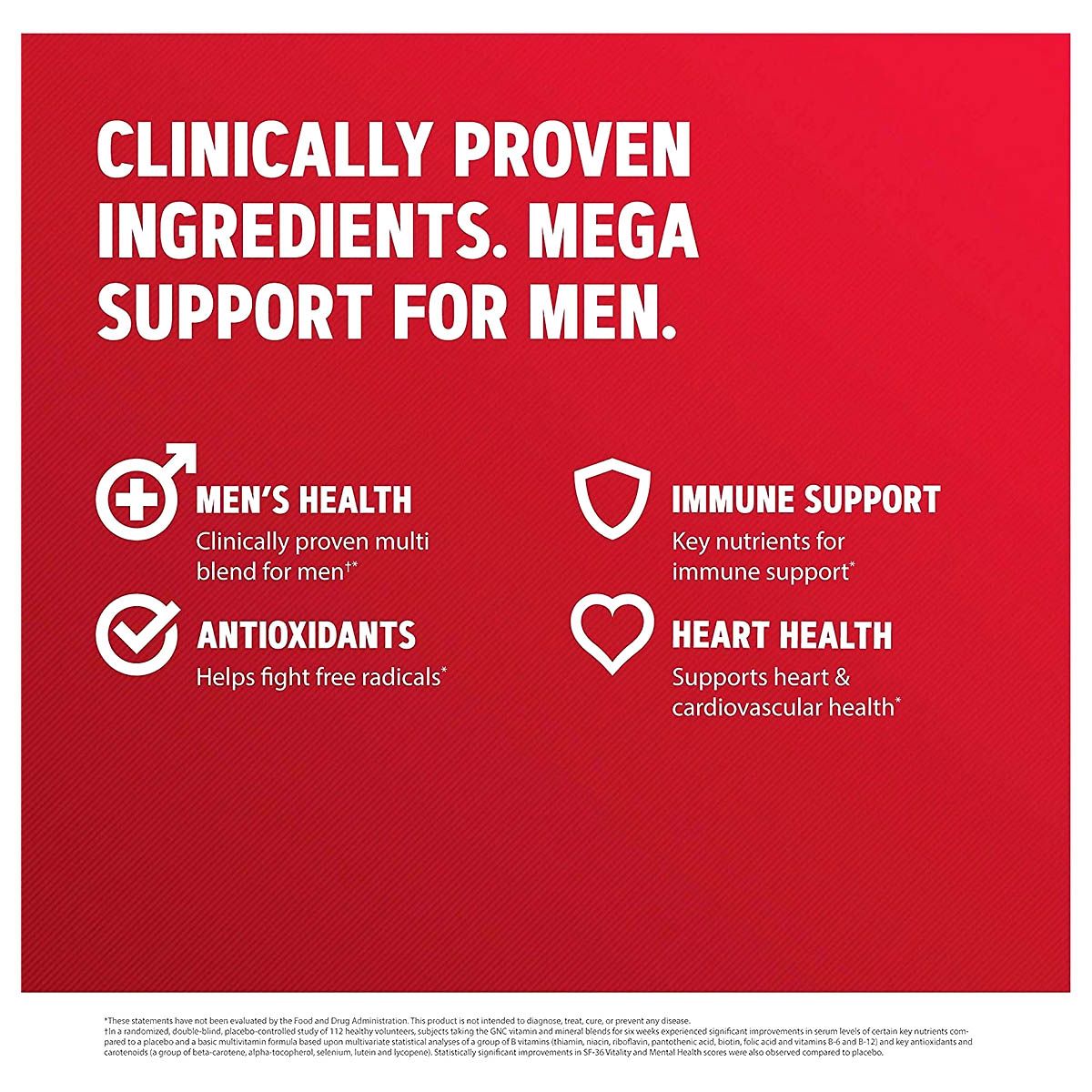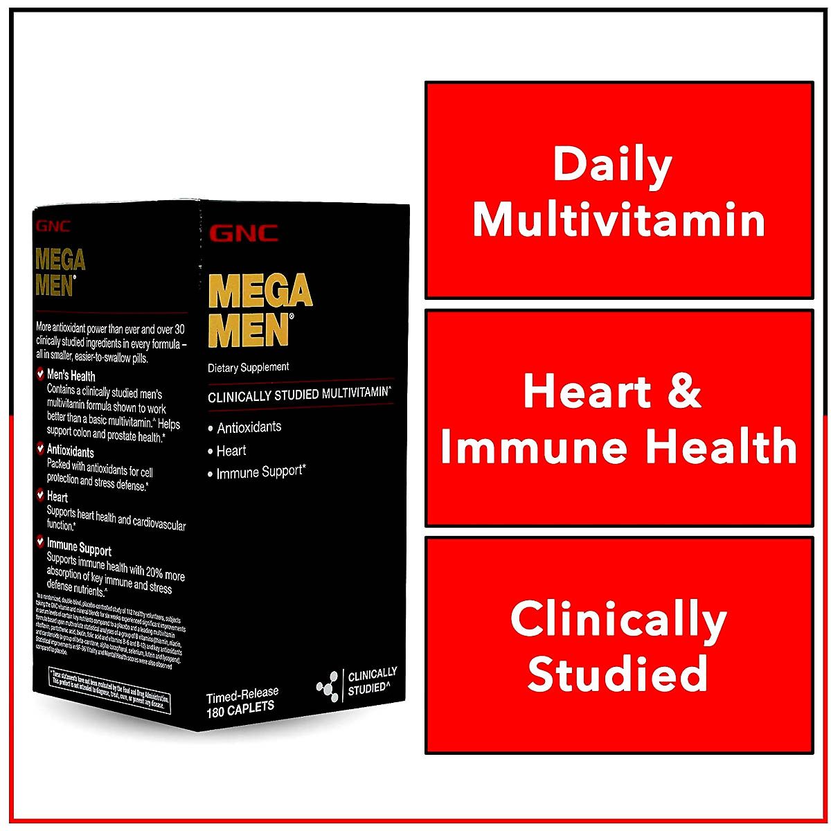 GNC Mega Men's multivitamin provides a scientifically formulated blend of antioxidants, B-alanine, and carnitine to support heart health, immune function, and energy metabolism with a unique timed-release delivery for optimal absorption.