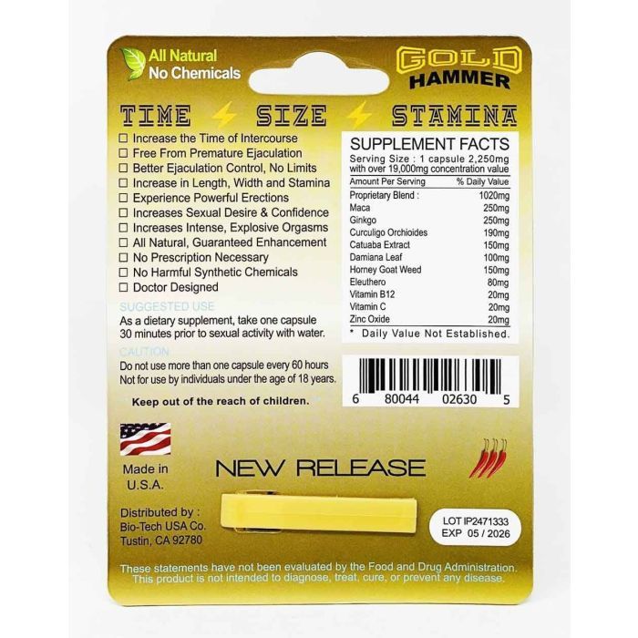 Featuring hero ingredients like Maca, Ginkgo, Curculigo Orchioides, Catuaba Extract, and Damiana Leaf, Gold Hammer Pill 19000 supports enhanced blood flow, energy, and explosive orgasms. Made in the USA, it contains no harmful synthetic chemicals and is doctor-designed for optimal effectiveness.