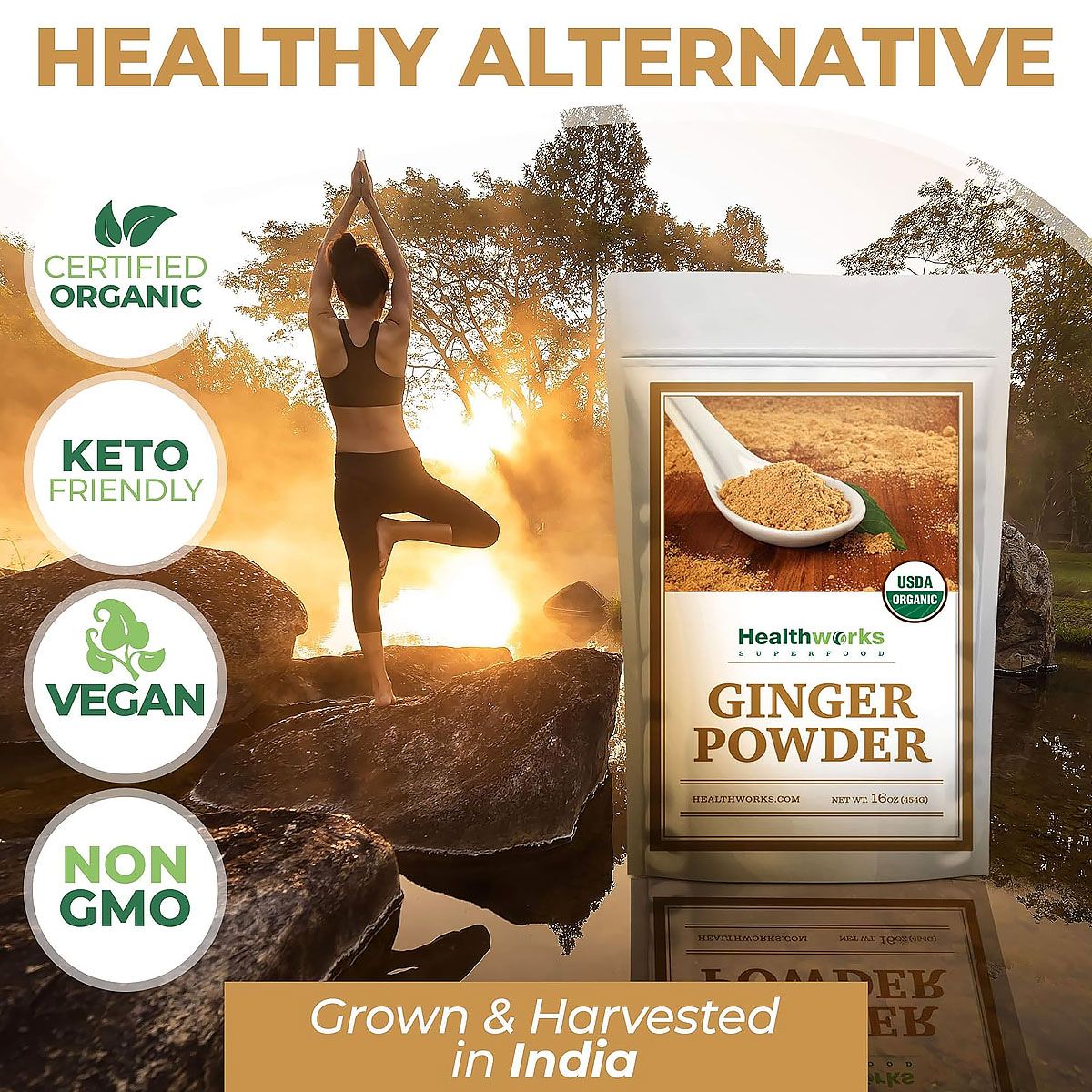 Healthworks Organic Ginger Powder delivers warming spice and natural wellness. USDA organic, gluten-free, and vegan. Perfect for teas, smoothies, or baking. Supports digestion and immune health. Convenient 1 lb resealable pouch ensures freshness. Pure, raw ginger with no additives.