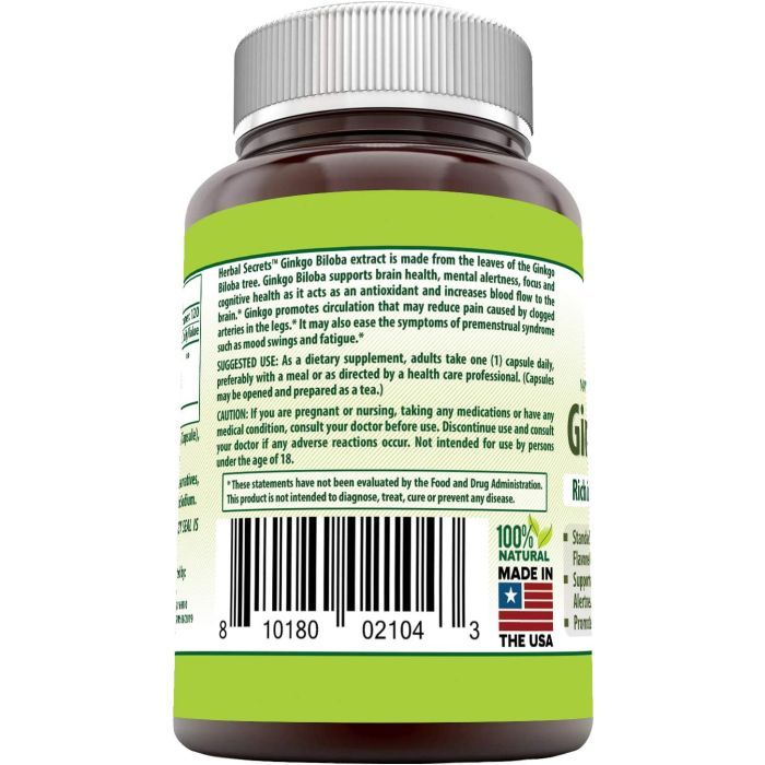 Herbal Secrets Ginkgo Biloba 120 mg contains a standardized extract known for its brain-supporting and circulation-enhancing properties.