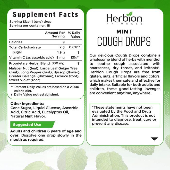 Herbion Naturals Mint Flavored Cough Drops provide soothing relief for coughs and sore throats. Each drop contains 5.5 mg of menthol, acting as a cough suppressant and oral anesthetic. The sugar-free formula is sweetened with Stevia, making it suitable for those monitoring their sugar intake.