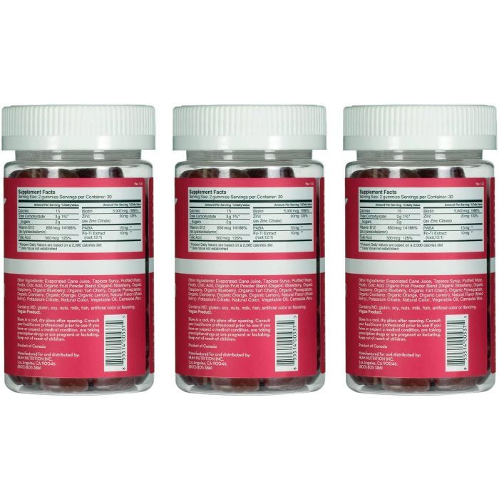Each serving delivers 5000mcg of biotin to boost hair strength, 850mcg of B12 to support cellular energy, and folic acid for follicle health. Zinc and PABA enhance overall scalp function, while Fo-Ti extract adds traditional botanical support for hair vitality.
