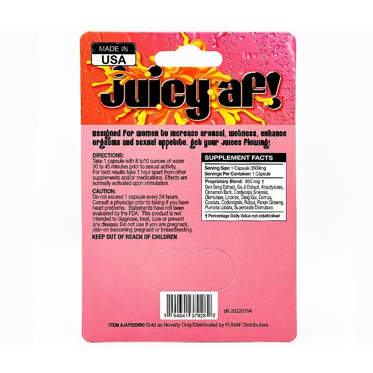 A: Juicy AF is a 72-hour lasting capsule designed to boost female arousal and natural lubrication.