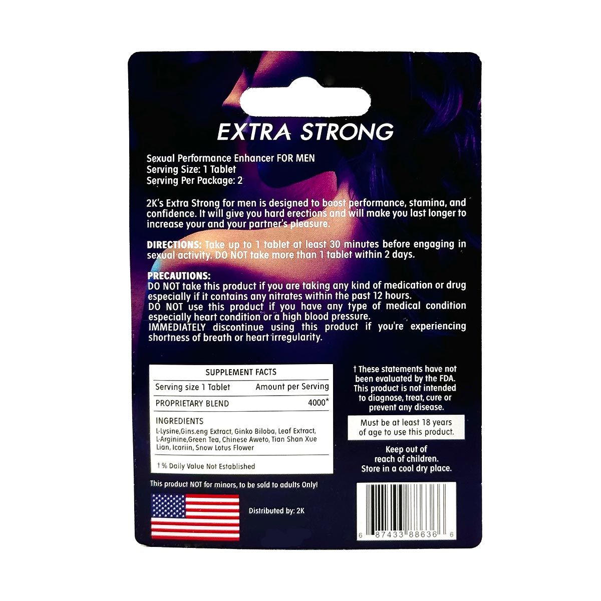 Kangaroo 2K Extra Strong is a powerful male sexual enhancer designed to boost stamina, increase sexual performance, and improve confidence. This natural formula combines potent ingredients such as L-Lysine, Ginseng Extract, Ginkgo Biloba Leaf Extract, L-Arginine, Green Tea, Chinese Aweto, Tian Shan Xue Lian, Icaririn, and Snow Lotus Flower to enhance blood flow, support erectile strength, and prolong intimate moments. Kangaroo 2K Extra Strong is perfect for men seeking longer-lasting, harder erections and enhanced sexual satisfaction. This product is doctor-designed and requires no prescription, making it an accessible option for men over 18 looking for a natural boost.