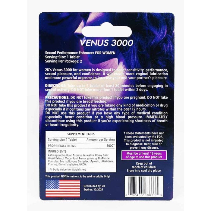 Kangaroo 2K Violet Venus 3000 is a potent female sexual enhancer formulated to boost sensitivity, increase sexual pleasure, and improve confidence. This product helps enhance vaginal lubrication and intensifies orgasms for more satisfying intimate moments. Made with a unique blend of natural herbs including Ashwagandha Root, Tribulus Terrestris, Horny Goat Weed Extract, Maca Root, Panax Ginseng, and other powerful ingredients, Kangaroo 2K Violet Venus 3000 is designed specifically for women seeking enhanced sexual performance and pleasure. This doctor-designed formula requires no prescription and is perfect for adult women over 18 years old.