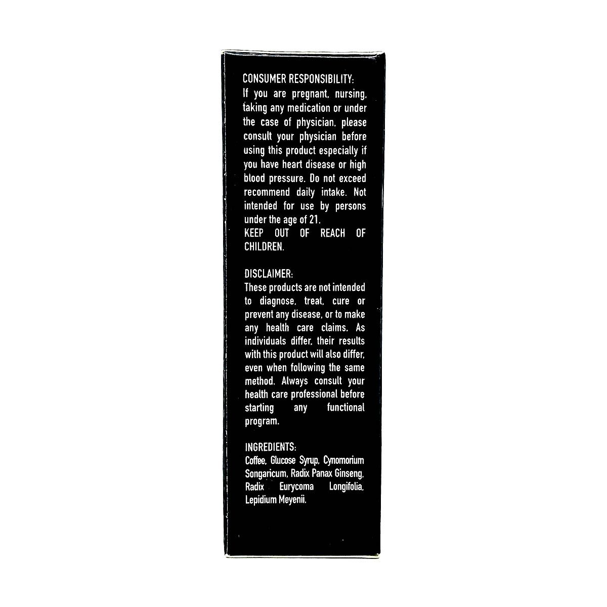 Ingredients include Coffee, Glucose Syrup, Cynomorium Songaricum, Radix Panax Ginseng, Radix Eurycoma Longifolia, and Lepidium Meyenii.