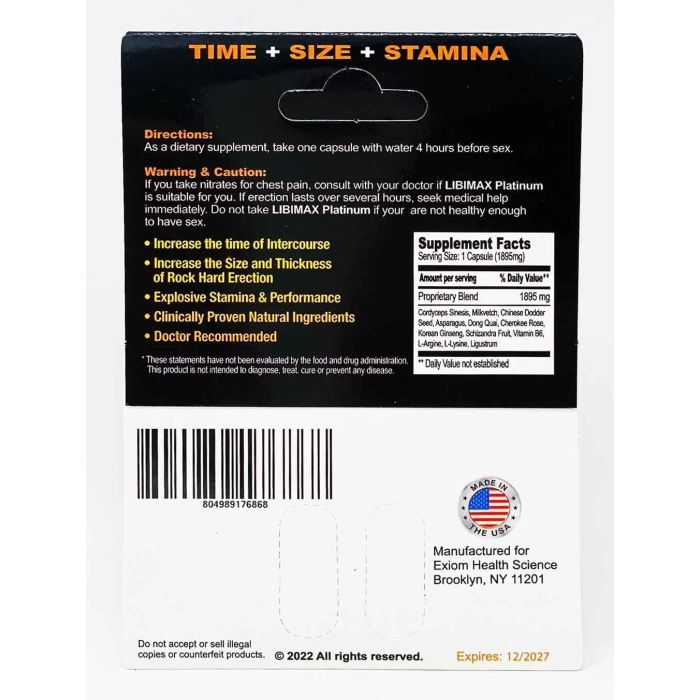 Featuring a proprietary blend of 1895mg per capsule, Libimax Platinum is doctor recommended and crafted in the USA with high-quality standards. It’s perfect for adult men looking to enhance their sexual vitality safely and effectively. The product is free from artificial colors, preservatives, and unnecessary fillers, ensuring a clean and effective supplement. Experience the benefits of Libimax Platinum for improved sexual confidence and performance.