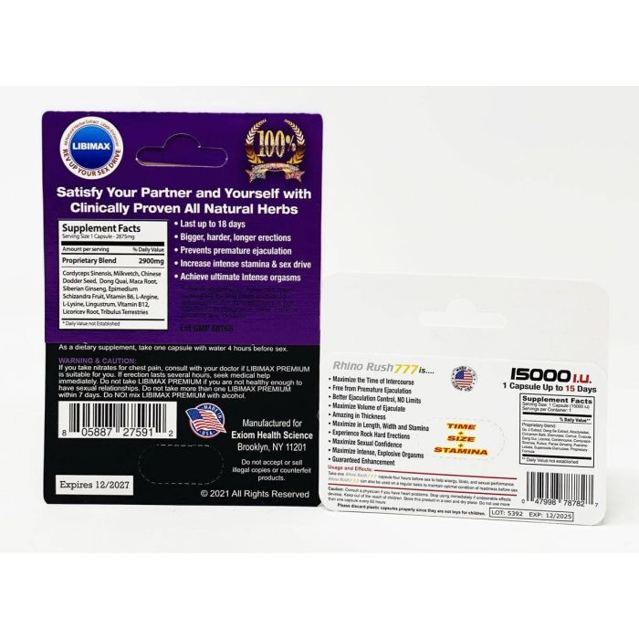 For Libimax Premium, take one capsule with 4 ounces of water 4 hours before sexual activity. For Rhino Rush 777, take one capsule 4 hours before sex to enhance energy, libido, and sexual performance. Both can be taken without food.