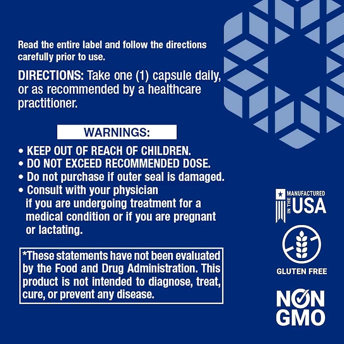 Warnings: This supplement is intended for adults only. Do not use if pregnant, nursing, or attempting to conceive. Consult your physician before use if you are taking medications or have a medical condition. Keep out of reach of children.
