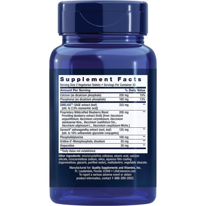 Life Extension Cognitex Elite 60 Vegetarian Tablets are a comprehensive brain health supplement designed to enhance cognitive function, memory, and mental clarity. Featuring potent hero ingredients such as SIBELIUSâ„¢ Sage Extract, Wildcrafted Blueberry Blend, Sensoriâ„¢ Ashwagandha Extract, and Phosphatidylserine, this formula supports neuroprotection and mental performance.
