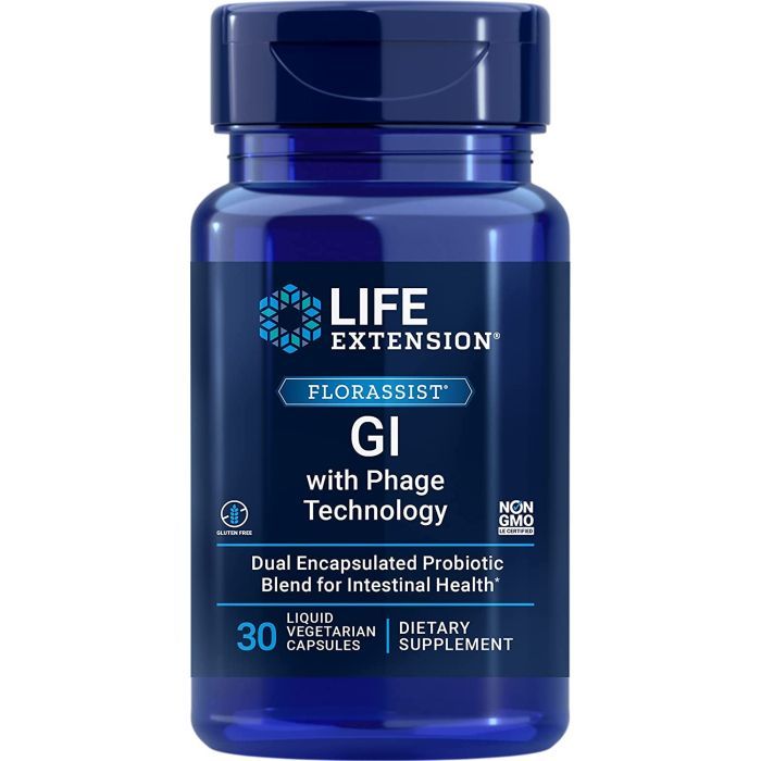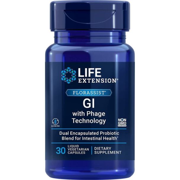 Life Extension FLORASSIST GI with Phage Technology delivers targeted probiotics and bacteriophages to support balanced gut health, digestion, and immunity.