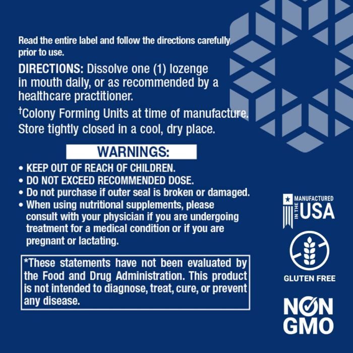 Take one vegetarian lozenge daily. Allow it to dissolve slowly in the mouth for optimal probiotic release and effectiveness. For best results, take after brushing your teeth or rinsing your mouth, and avoid eating or drinking for at least 30 minutes afterward.
