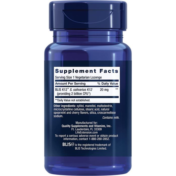 - Delivers 2 billion CFU of BLIS K12 Streptococcus salivarius K12