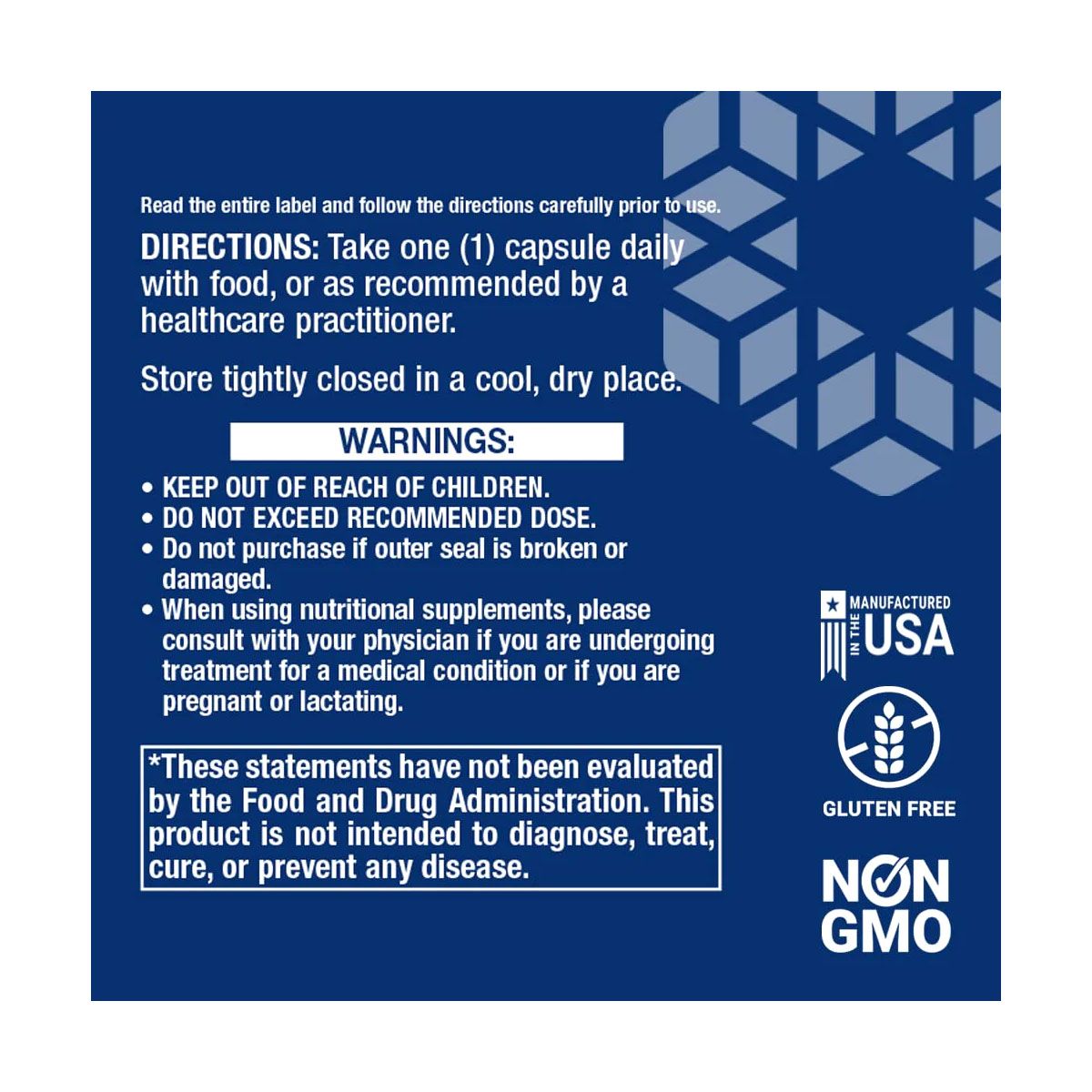 Warnings: If pregnant, nursing, or under medical care, consult your healthcare provider before use. Do not exceed the recommended dose. Keep out of reach of children.