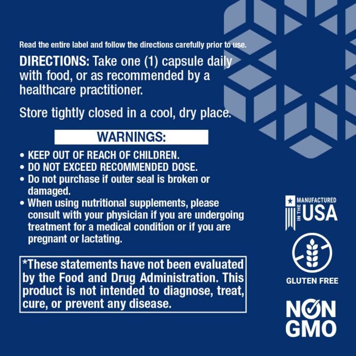 Warnings: Do not exceed recommended dosage. Pregnant or nursing women, or those with medical conditions, should consult their healthcare provider before use. Keep out of reach of children.