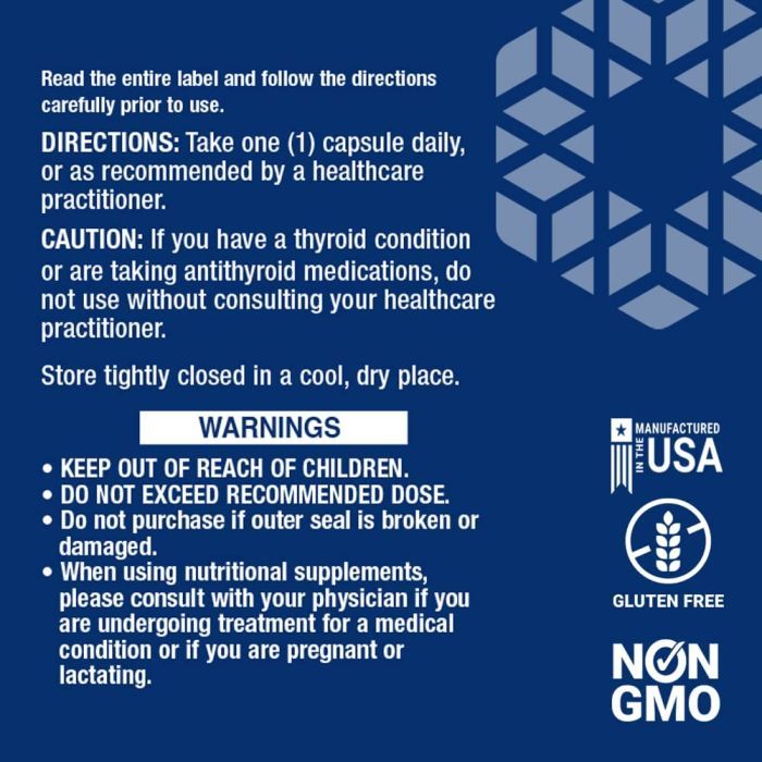 Consult a healthcare provider before use if pregnant, nursing, or taking medications. Avoid exceeding the recommended dosage. Individuals with thyroid disorders should seek medical advice before use.