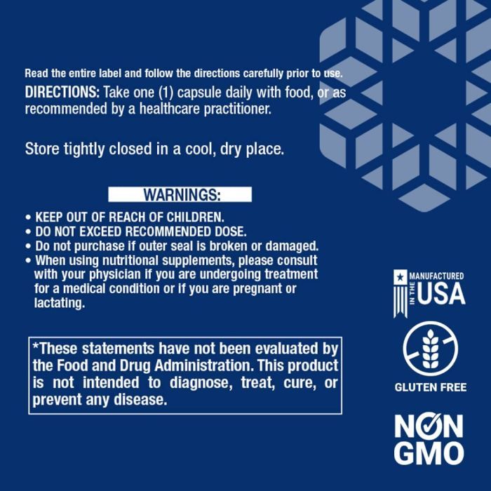 Take one (1) capsule daily with food, or as recommended by a healthcare practitioner. Store in a cool, dry place after opening.