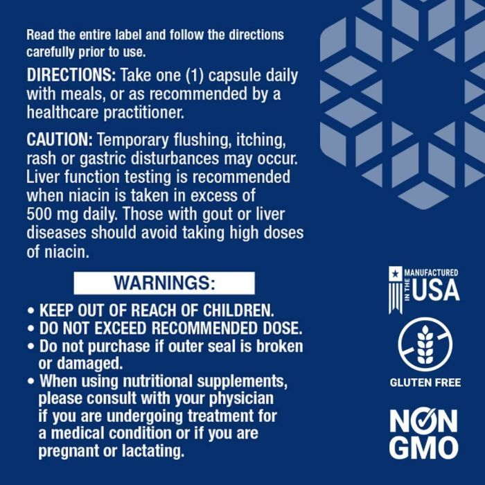 Take 1 capsule daily, preferably with meals to minimize flushing. Consume with a full glass of water. Since niacin may cause temporary flushing, start with a lower intake if sensitive.