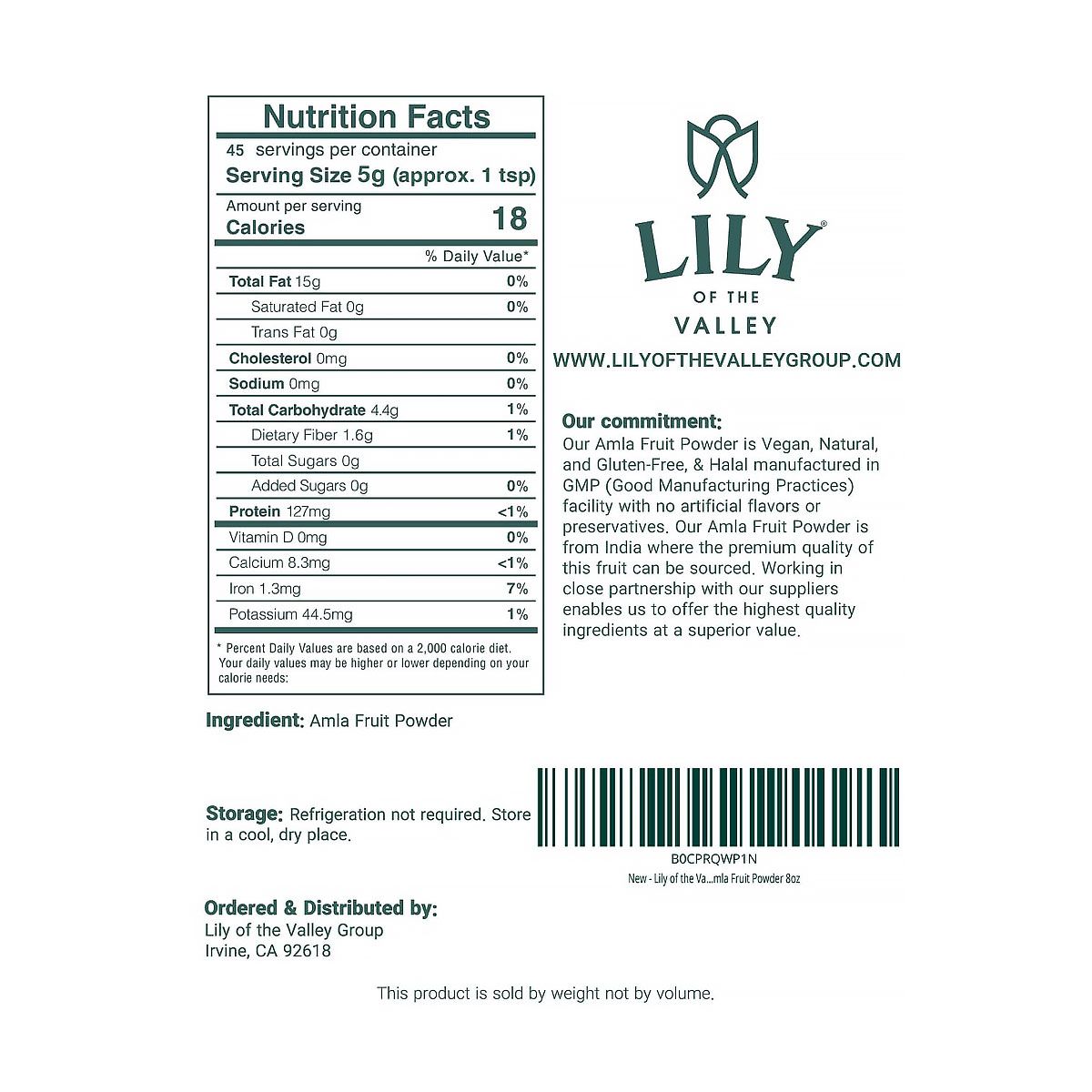 | Lily of the Valley | Amla Fruit Powder | 5g (approx. 1 tsp) | Powder | 8oz (226.7g) |
