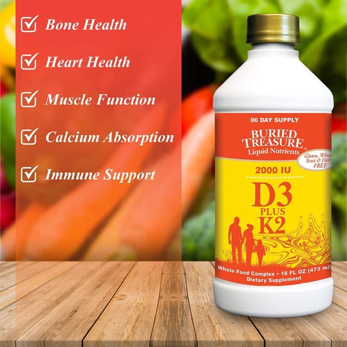 Boost your health with Buried Treasure Liquid Vitamin D3 Plus K2. 2000 IU of D3 with K2 for calcium absorption. Supports bone, heart, and immune function. Superior absorption in liquid form. Vegetarian, gluten-free, yeast-free, dairy-free. 96-day supply per 16 fl oz bottle.
