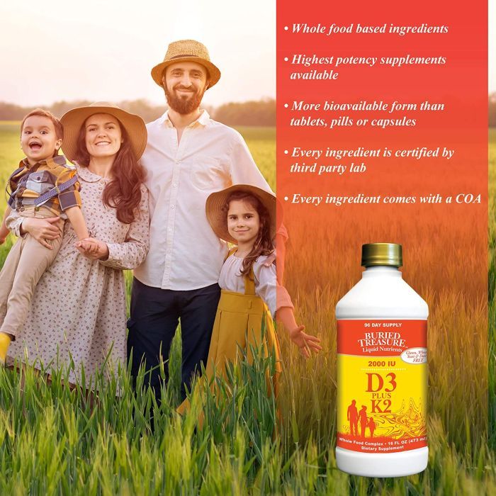 Take 1 tablespoon daily of Buried Treasure Liquid Vitamin D3 Plus K2 with food for optimal absorption. Shake well before use. Because this formula is in liquid form, it is absorbed more efficiently than tablets or capsules.
